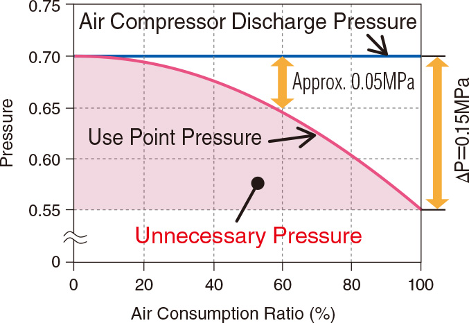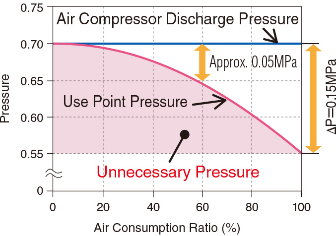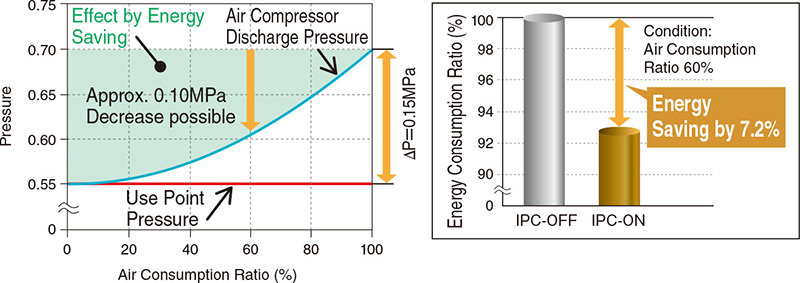 By estimating use point pressure in accordance with air consumption, IPC control decreases discharge pressure during low load operation, which enables Energy-Saving.