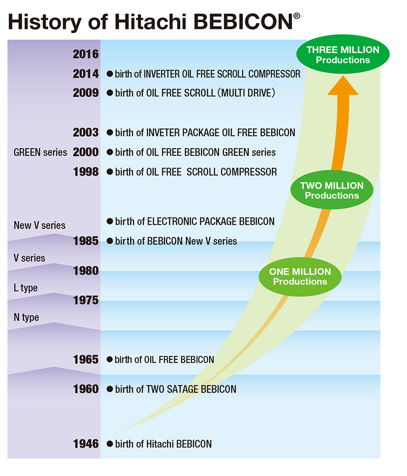 Hitachi is one of the oldest Japanese air compressor manufacturers. BEBICON debuted in 1946 as registered trademark of Hitachi small air compressor. BEBICON is used in various areas of industry, such as engineering and metalworking industry, mining industry and building industry. Hitachi has achieved ONE Million product shipments by 1979, TWO Million by 1994, and THREE Million by 2016.