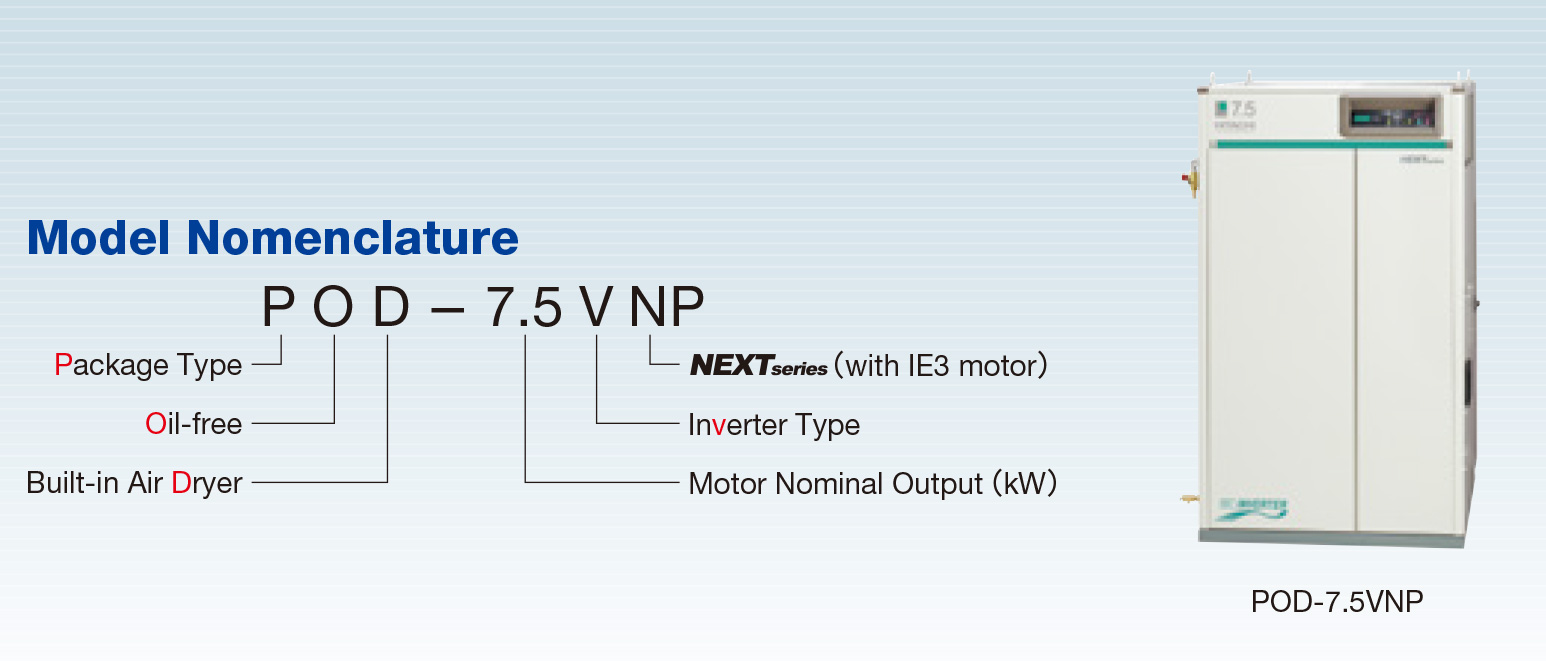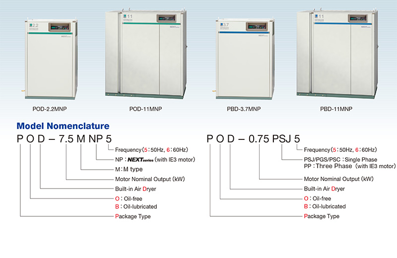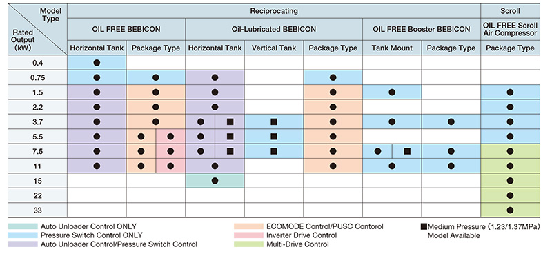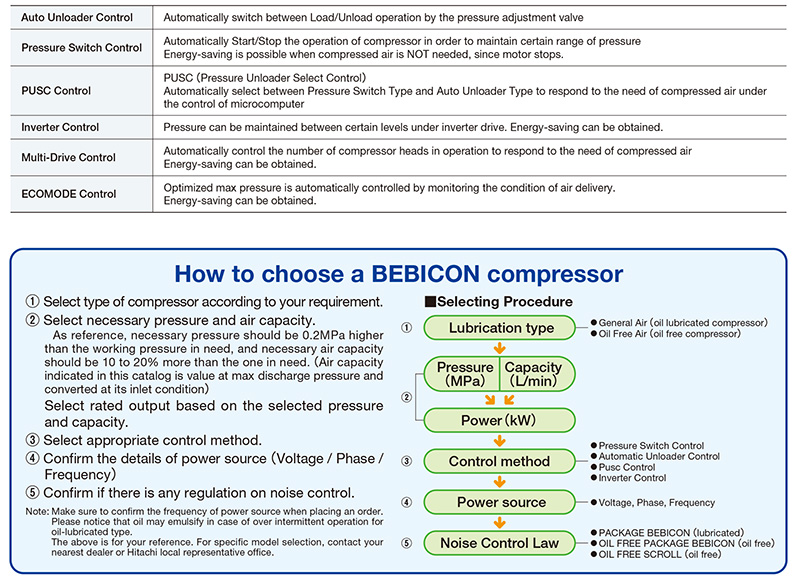 Hitachi has introduced compressors of Oil-free type, Package type and Scroll type, always one-step ahead of the customers’ needs. Hitachi developed and introduced INVERTER PACKAGE OIL FREE BEBICON and OIL FREE Booster BEBICON to meet customers’ need of energy-saving and environment protection. Hitachi believes that our BEBICON compressor can satisfy your various needs and help you grow your business.