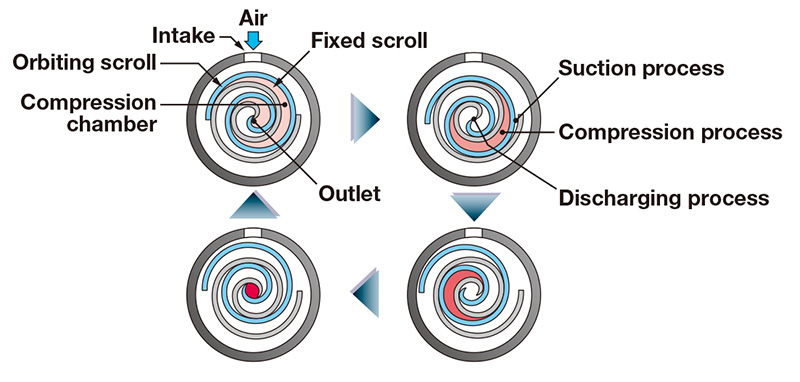 - Compression chamber becomes minimum volume at the center of the scroll and air is pumped out through air outlet located at the center of scroll.