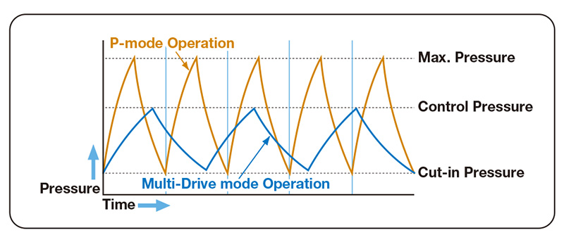 The operation of compressor is automatically controlled to keep the pressure around necessary pressure(control pressure). Unnecessary power consumption is prevented by avoiding the pressure to reach max pressure. So, energy-saving is possible.