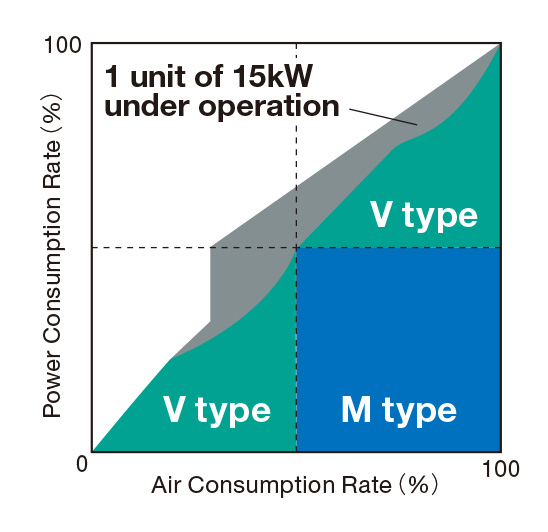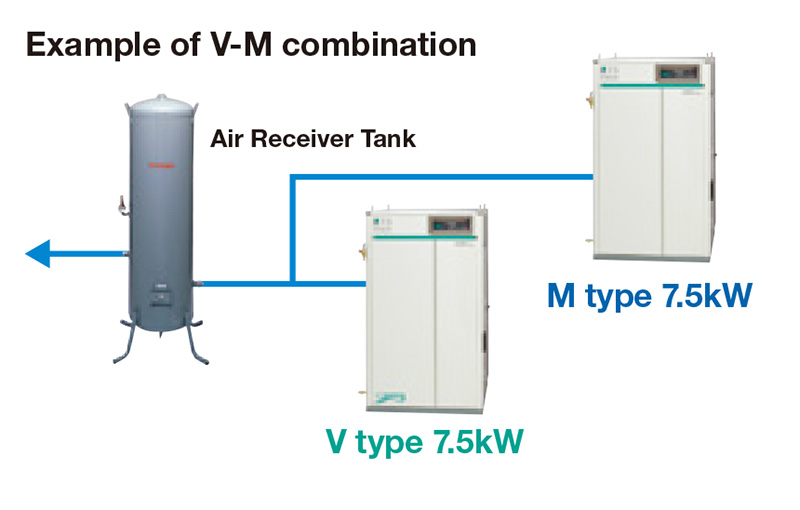 If you have 1 unit of 7.5kW M type installed and the air requirement is 15kW class, add 1 unit of 7.5kW V type. Energy-Saving of V type can be obtained compared with the cases of replacing with 1 unit of 15kW M type or adding 1 unit of 7.5kW M type.